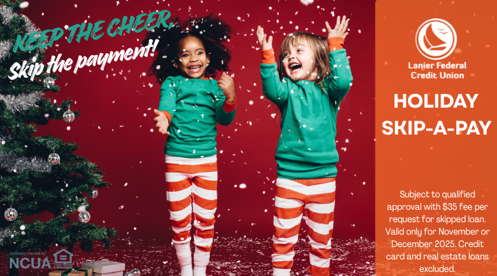 Keep the cheer, skip the payment! From now until December 31st, you can opt to skip your November or December loan payment(s) and use the funds for other expenses. Call a loan officer at 770-503-1765 for details or get started now!